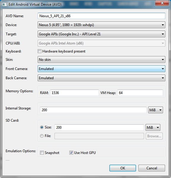 - Target: Google APIs x86 (Google Inc.) - API Level 19 (Make sure you select the target with Google APIs in the name.)