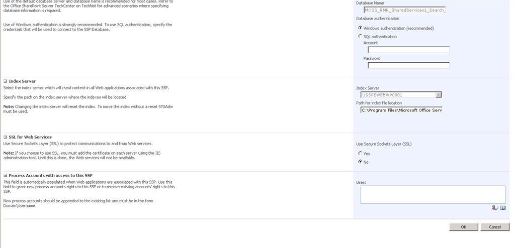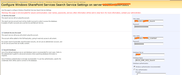39. Enter Database server and Database name for Windows SharePoint Services Search under the Search Database section.