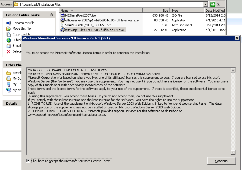 65. Double-click on SharePoint service pack 1 exe file. Check the check box and click on Continue.