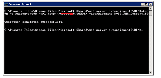 Attaching the content DB to newly created web application and for mysites stsadm -o addcontentdb -url http://weburl/ -databasename MOSS_CONTENT_80_P
