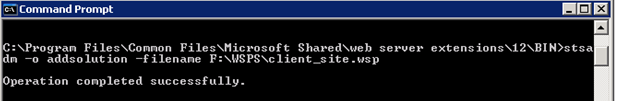 74. Syntax: stsadm -o addsolution -filename F:\WSPS\client_site.wsp