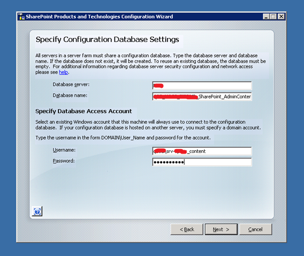 14. Enter the user with Administrative permissions on the SQL Server . The user name should be in the form of Domain\User Name. (In other words ur content DB account) and click Next.