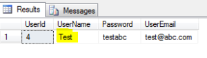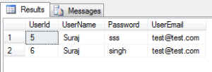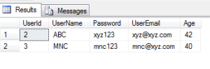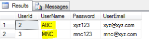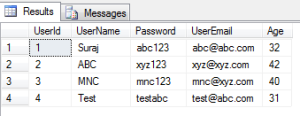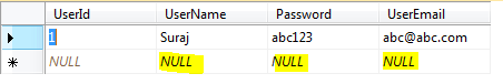 Here as you can see we have added only the three column values since the primary key userId is auto-incremented, in other words an Identity column. Thus, this adds the values. For a faster approach, usually developers use the SSMS UI here also to add the records. We right-click on the specific table into which we will be adding records, then click on the Edit Top 200 (default value) items. Then we see in a new query window the table columns with the rows of records already added and a default empty row where we will be adding the values as in the following: