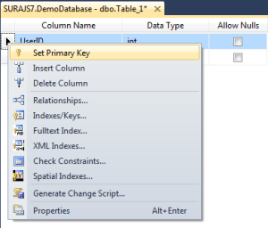 Thus, we have created a database that now has a table named User. Now for your information, we can also create a table using the SSMS UI as we have done for the database. We open up the database tree structure and find Tables as a chile tree under it. We right-click on that and select New Table, we get a different UI in the query window now asking for the column names and the datatypes also to set the Nullable/NonNullable with a check box, then let's view the images: Add the Primary key column and set it as Primary Key as in the following: