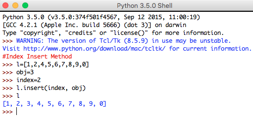 This method is used to insert an element in list at index specified as input. It consists of two parameters and they are explained as below: