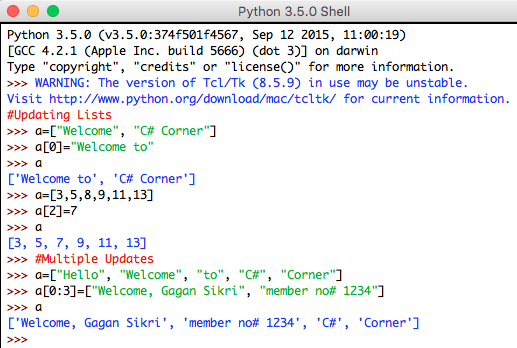 Python allows updating single or multiple elements in lists. The following are some examples depicting list update: