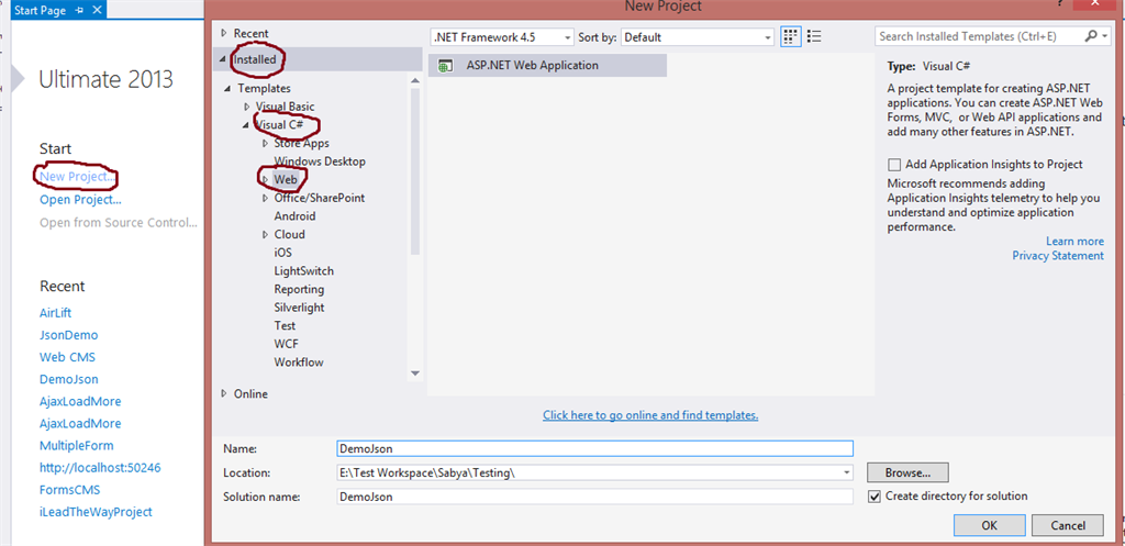 Under Installed, Templates, Visual C#, click Web and provide the name and click OK as per the following image.