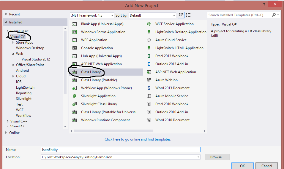 Step 4: After this a window will pop up, click Installed, Visual C#, then Class Library as in the following image and click OK,
