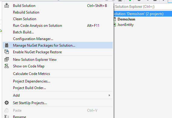 Manage NuGet Packages for solution as in the following images,