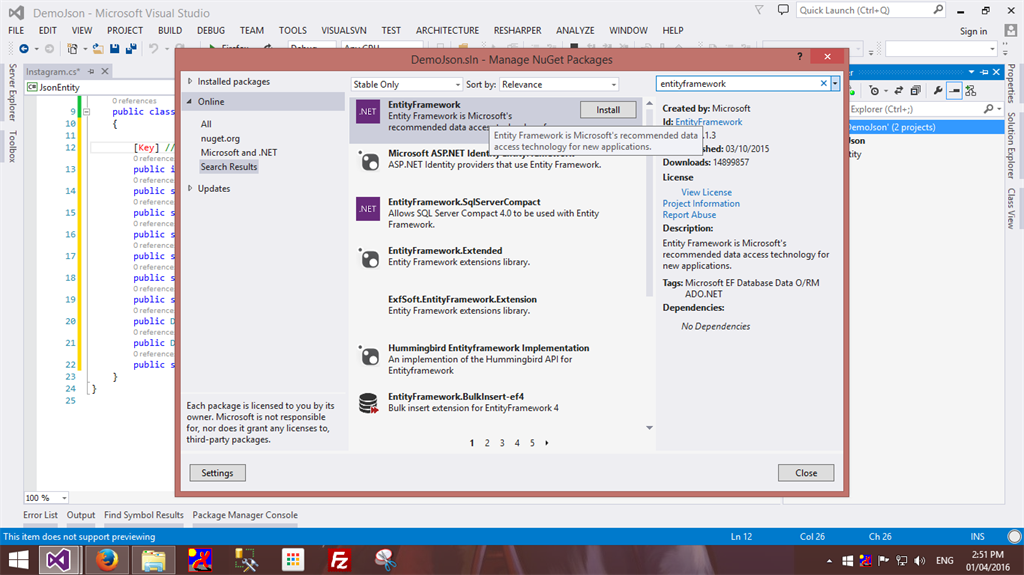 - From nuget added reference Newtonsoft.json and entity framework.