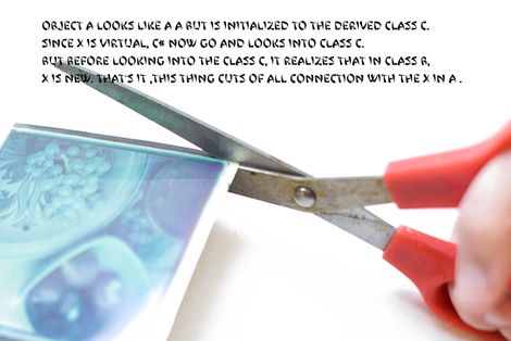 Yes, that's the problem with virtual methods. Sometimes they are too confusing, the result is entirely different from what we expect. Object a looks like a A but is initialized to the derived class C. Since X is virtual, C# now looks into class C. But before looking into the class C, it realizes that in class B, X is new. That's it, this thing cuts of all connections with the X in A. Thus the keyword new is preceded with virtual, otherwise the override modifier would give us an error in class C. Since X in class B is marked as a new method, having nothing to do with the class A, class C inherits a new that also has nothing to do with the class A. The X in class C is related to the X of class B and not of class A. Thus the X of class A is invoked.