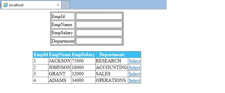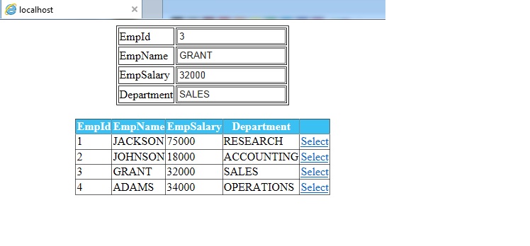 - Now I am selecting EmpId 3, see the Empid 3 row cell values will be populated in the corresponding textboxes.