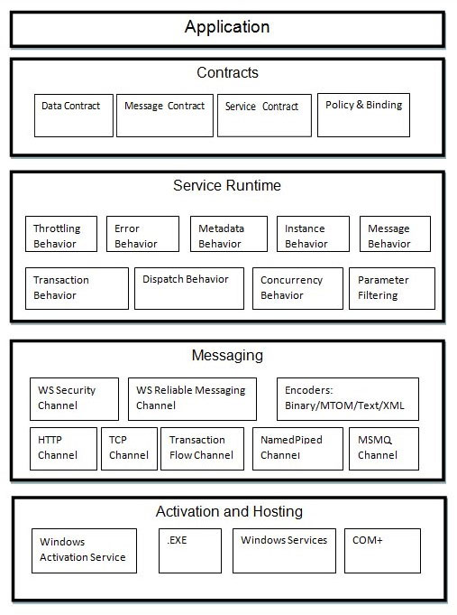 Activation and Hosting (Layer 4): This layer supports the execution of services in various environments, such as Windows Services, IIS and Windows Activation Services (WAS). A service can either be self-hosted or hosted in the context of another application. Let us briefly learn about them.