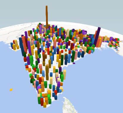 After selecting the right geographic property for the fields the Power Map will start plotting the data as dots on the globe as shown.