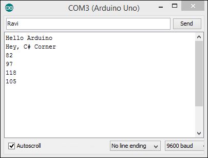 Here, we ed the input as “Ravi” and the Serial Monitor accepts my string and parses (converts) it into a byte data type since we have declared user_input as a byte type. And, it converts "R","a","v","i" to the respective ASCII values since the byte data type stores only ASCII values.