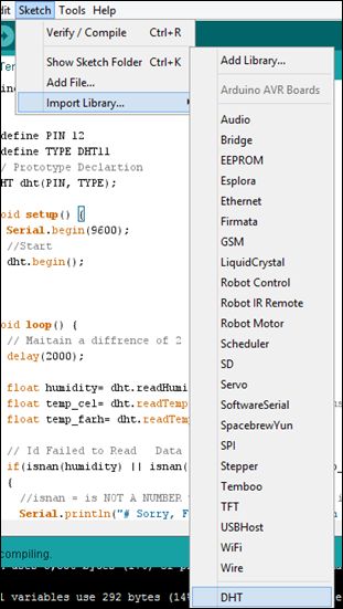 Since I am using DHT11, my DHT TYPE is DHT11. Next, we tried to define that dht() method where we are ing Digital PIN (in other words 12) and DHT TYPE as arguments.