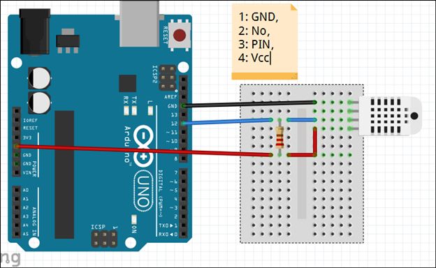 First, mark your DHT to indicate which PIN belongs to what. The first PIN will always be GND (ground), then the second will be NAN (No Connection), the third will be the Digital PI that intacts with Arduino and the last PIN will be the Vcc (5 volt) power supply.