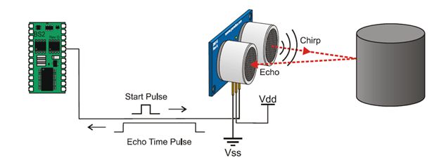 The HC-SR04 module sends an ultrasonic short pulse signal from the trigger and listens to the signal from the echo when it bounces back from the object.