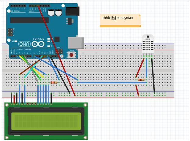 Apart from the LCD code, we have discussed all the sections of the DHT in our previous article. For the rest, we have used a few new functions, like lcd.print() to print on the LCD and then lcd.setCusor() to point the cursor on the LCD. We have used (0,1) as an argument because that specifies the 0th column and first row.