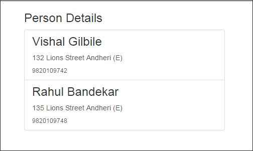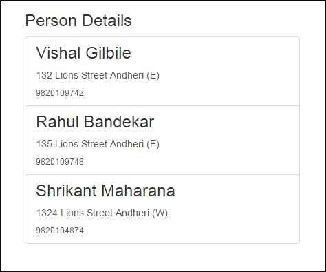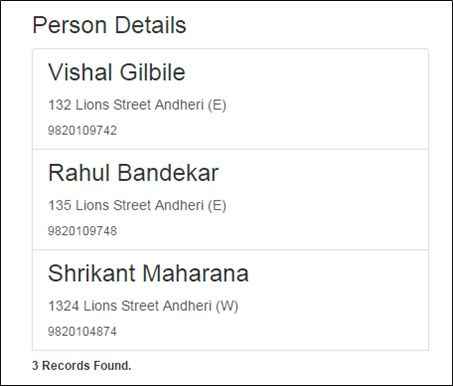 - { Name: "Vishal Gilbile", Address: "132 Lions Street Andheri (E)", ContactNo: '9820109742' },