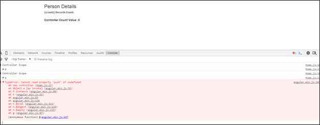 From the above snapshot we can see that the controller count model value is still zero while the custom directive count model value is 3 which is the length of the person array. So this states that the count model defined inside our custom directive is only accessible to the $scope object of our custom AngularJs directive and not to the controller $scope object.