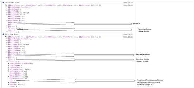 Also to prove this more we can log both the $scope object and see whether the count model is different for the controller $scope object and for directive $scope object.