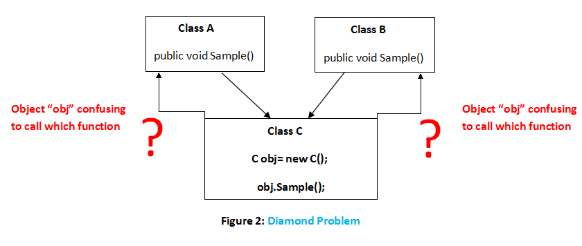 Two classes inherited to another class “C”. Create object for “C” class and try to access method at that time. While accessing, the compiler will get confused to access the method because the two class methods are of the same name. This is called diamond problem.