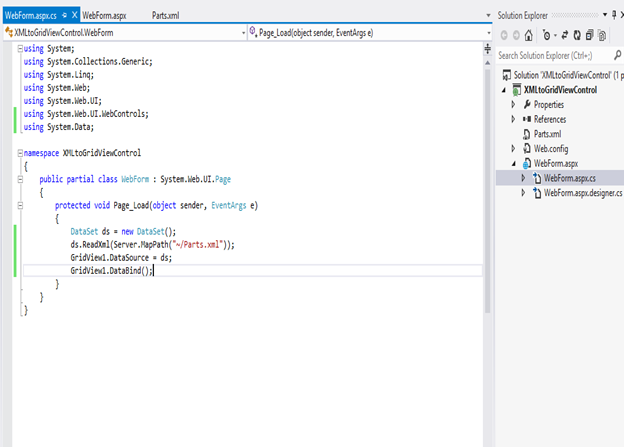 - ds.ReadXml(Server.MapPath (“~/Parts.Xml”));