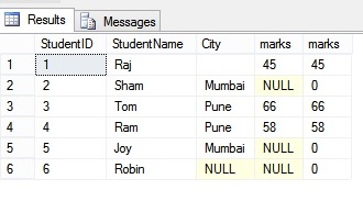 Here, the ISNULL() function first checks the marks column, where ever it finds the NULL values, it replaces them with 0. This is just for display purpose. Internally the table still contains the NULL values.