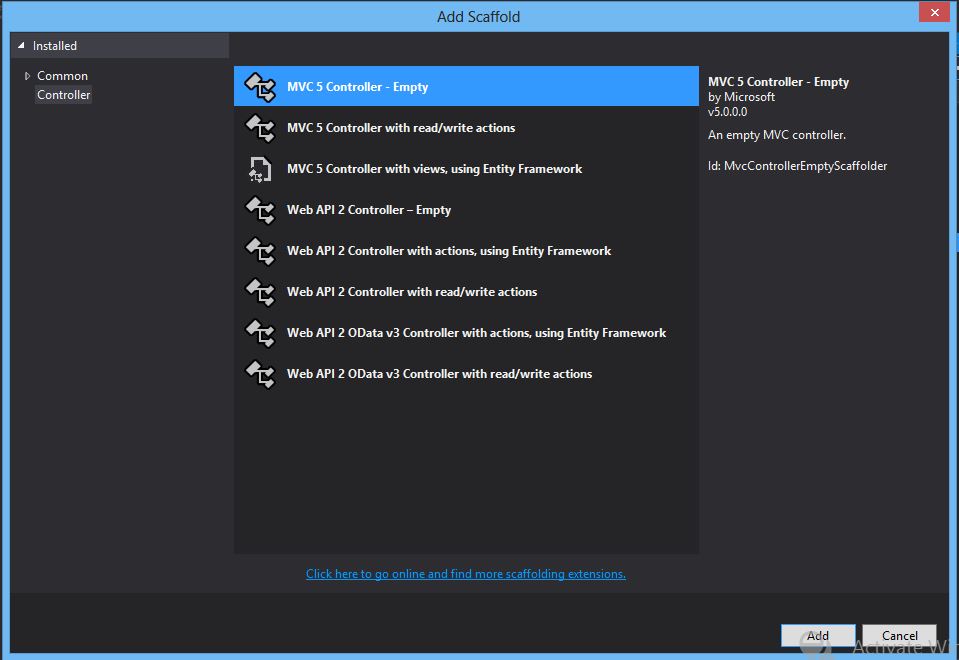 Now in your solution explorer, there is a folder name Controller. Select the folder and right click the mouse and click on Add a Controller.