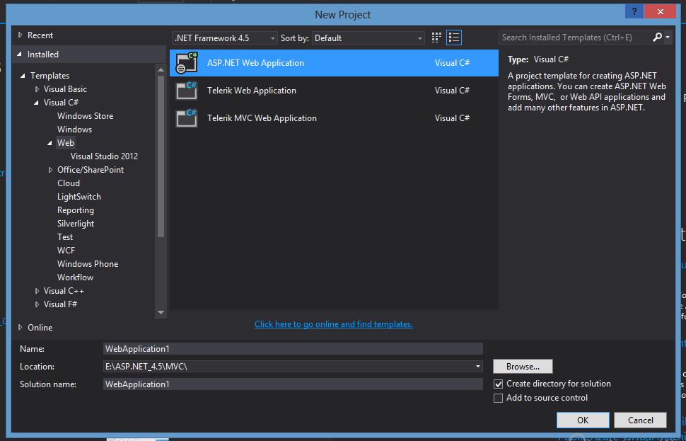To implement this, we will start by creating an ASP.NET MVC Application. For these, you can press CTRL + SHIFT + N or you can click on "File" -> "New" -> "Project...". Then select ASP.Net Web Application and provide the project a name and click the OK button.