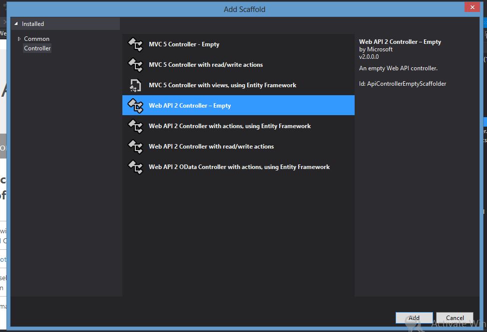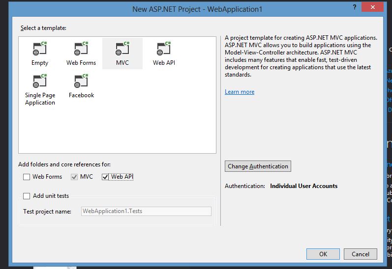 Now, in the next tab, select MVC application and below that check the MVC and Web API Check boxes and click on the OK button.
