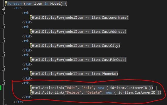For this, we customized the Index Page of the previous article. In the table structure where we display the data, add a new column to add two new link buttons for it.