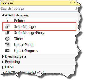 2. Add ScriptManager from AJAX Extensions (from v15.1 of AJAX Control Toolkit, ToolScriptManager is removed. Use Standard Script Manager).