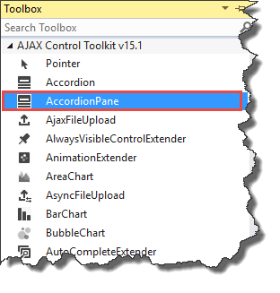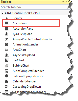 3. Go to AJAX Control Toolkit in Toolbox and drop Accordion Control on Default.aspx.