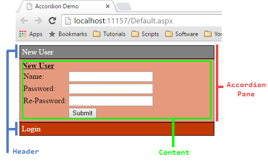 In the above code, I have used .headerCssClass (CSS class to use for the headers),.contentCssClass (CSS class to use for the content) and .headerSelectedCss (CSS class to use for the Selected headers) class for styling the Accordion Control.