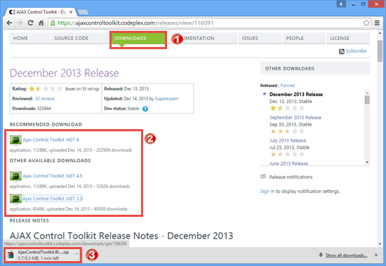 Or Click on Downloads link in the menu and select the Ajax Control Toolkit release according to your need. On clicking, AJAX Control Toolkit starts downloading.