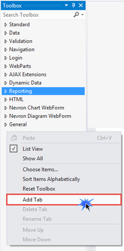 3. Open Visual Studio, Right Click in ToolBox and then click on Add Tab.