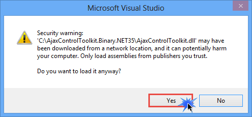 6. After clicking on the Open button, Visual Studio displays a security warning. Click on Yes.