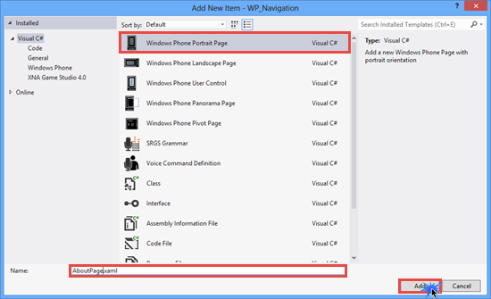 In the preceding code, we have called the Navigate method that navigates to the content specified by the Uniform Resource Identifier. We set UriKind.Relative because AboutPage.xaml is part of the same project or XAP file. We have already added a HyperlinkButton on AboutPage.xaml. We will use this for navigating back to the previous page. (We don't need to code for the hardware back key button in Windows Phone for navigating back to the previous page.)