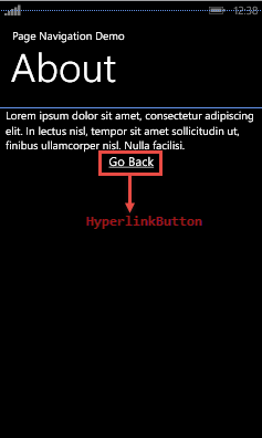 - <HyperlinkButton Name="hlb_GoBack" Content="Go Back"/>