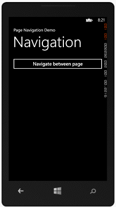 1. Navigation from one page to anotherCreate a New Windows Phone Application and select Windows Phone 8.0 as a target Windows Phone OS for this application and click on OK. Drop a button control into MainPage.xaml as shown in the following image and name it btn_navigationPage.