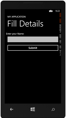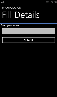 Let's create a new project and add a page (name it FillDetails.xaml). Drop a TextBox (named txt_Name) and Button (named btn_Submit) control onto it.
