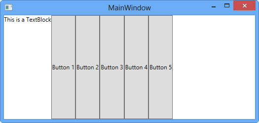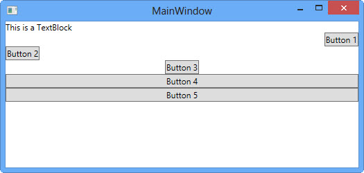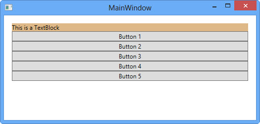 In this example, I have added one TextBlock and 5 Buttons to a StackPanel. By default, a StackPanel arranges child elements from the top to bottom. All elements inside the StackPanel are streched to the fullest width of the StackPanel.