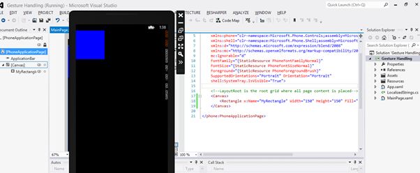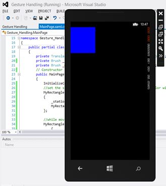 6. If you try running it, it will not run as expected, the rectangle will not be moving or changing color as expected. That's because we need to apply the ManipulationMode of the rectangle (UL Element) to All in the XAML file. Not in case using using System.Windows.Media namespace for the rectangle.