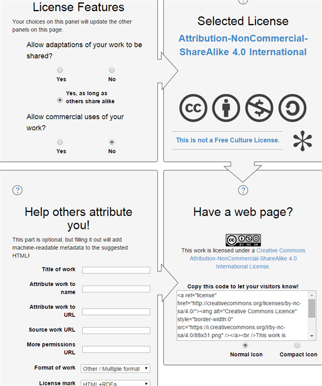 Creative Commons website showing a user-friendly form to select a license for your content.