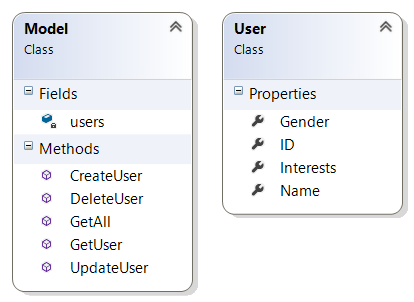 I have created a basic example of objects for you that I will be using. A simple model structure for our object, User. I have another class (with all the static members) that will serve us for our model data source. The following is the class diagram for them: