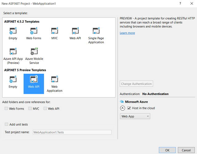 - An ASP.NET 5's Web API (stand-alone, do not confuse yourself with the Web API + Web Application template).
