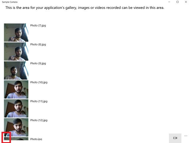I created the gallery using a new page control, that has a separate bottom app bar and other details, thus allows us to abstract the camera controls and the library controls from each other. The main idea is that in the library the user must be able to get a list of images that he has captured, a list of videos that he has recorded and to be able to preview. We only need a ListView control, or a GridView based on how we want to design everything. We can then bind the list of media files to these lists and show them to the user.