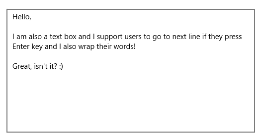 This control wraps the words when the user hits the right-most corner of the control. It also provides the user with the ability to go to a new line if he wants, such as in "Hello,". This is the same control but with a few other options. You can make other changes if you want to.
